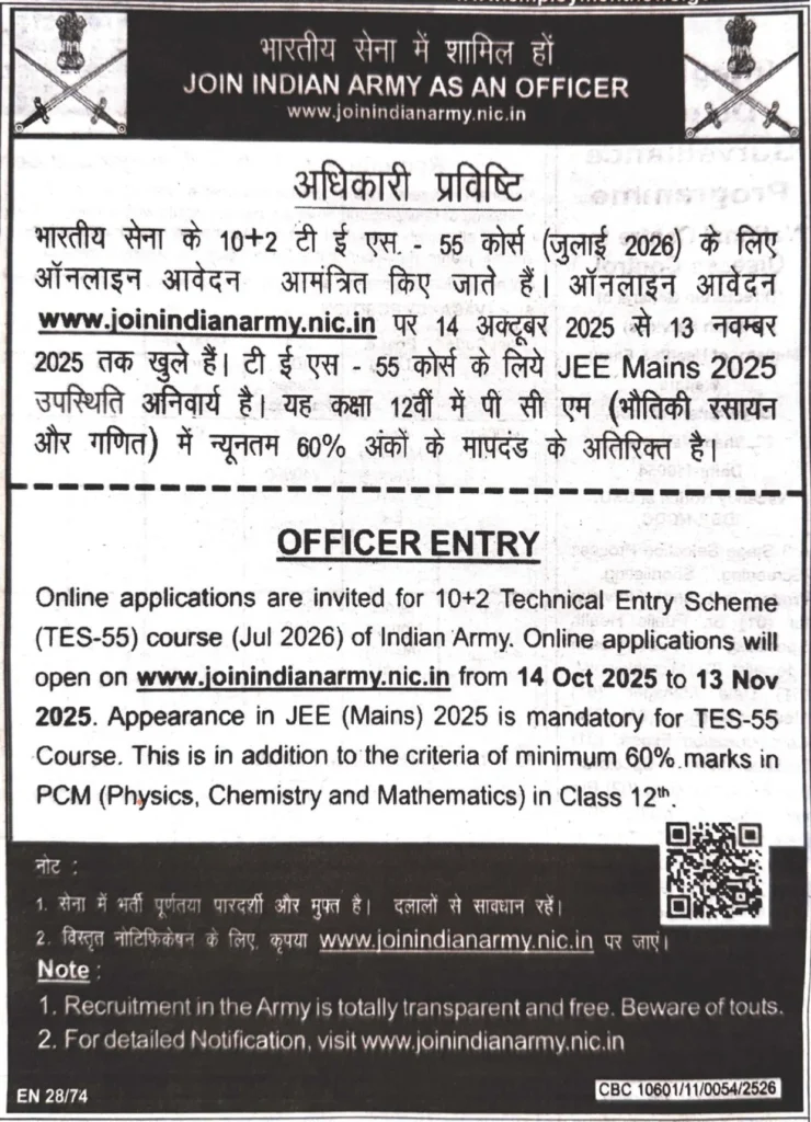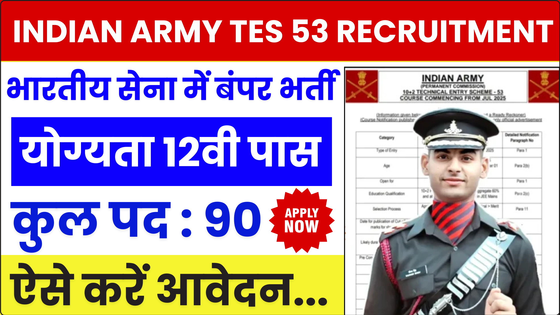 भारतीय सेना ने 10+2 टेक्निकल एंट्री स्कीम (TES) 55 बैच के लिए नई भर्ती 2025 का नोटिफिकेशन जारी किया है। इस भर्ती के तहत 90 पदों पर आवेदन आमंत्रित किए गए हैं। इच्छुक उम्मीदवार जिन्होंने JEE Mains 2025 में भाग लिया है और 10+2 (फिजिक्स, केमिस्ट्री, मैथ्स) में कम से कम 60% अंक प्राप्त किए हैं, वे आवेदन कर सकते हैं। आवेदन प्रक्रिया 14 अक्टूबर 2025 से शुरू होगी और 13 नवंबर 2025 तक चलेगी। यह उन युवाओं के लिए सुनहरा अवसर है जो भारतीय सेना में अधिकारी बनने का सपना देखते हैं।