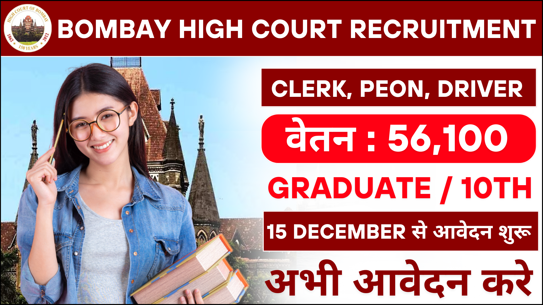 Bombay High Court ने Clerk, Peon, Driver, Steno Lower, Steno Higher सहित कुल 2381 पदों के लिए बड़ी भर्ती निकाली है। 10वीं पास तथा Graduate दोनों ही आवेदन कर सकते हैं। Online आवेदन 15 दिसंबर 2025 से शुरू होंगे और 5 जनवरी 2026 तक चलेंगे।