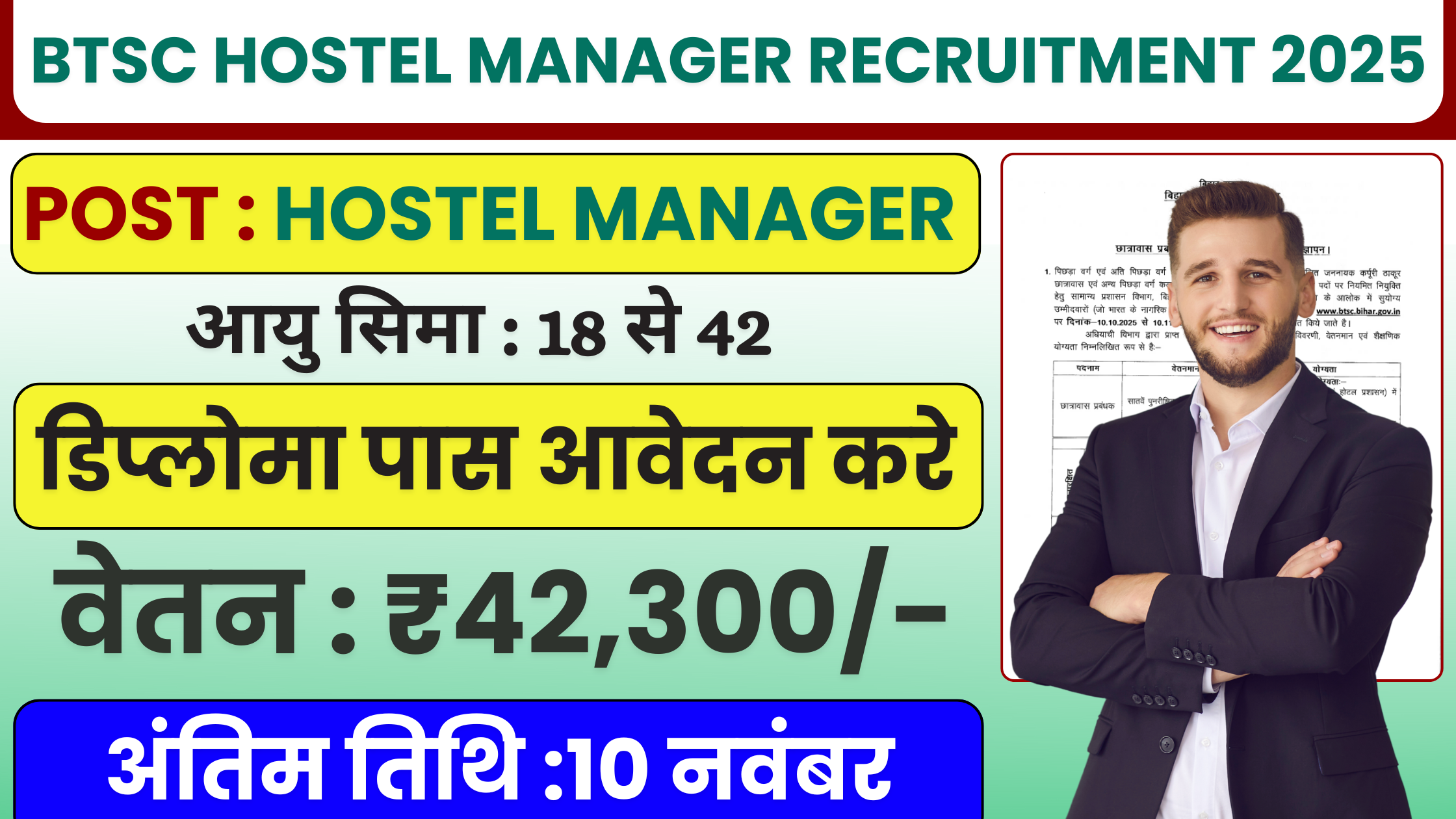 यदि आप Hospitality या Hotel Management क्षेत्र से हैं और बिहार सरकार में नौकरी की तलाश कर रहे हैं, तो BTSC Hostel Manager Recruitment 2025 आपके लिए एक सुनहरा मौका है। यह पद न केवल प्रतिष्ठित हैं बल्कि स्थायी सरकारी वेतनमान भी प्रदान करते हैं। समय पर आवेदन करें और अपने करियर को नई दिशा दें।