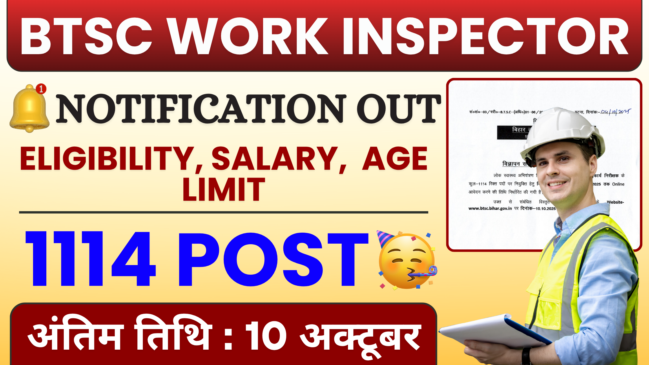 Bihar Technical Service Commission (BTSC) ने Work Inspector (कार्य निरीक्षक) के कुल 1114 पदों पर भर्ती की घोषणा की है।