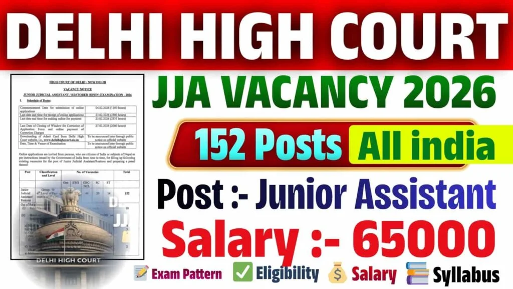 अगर आप दिल्ली हाई कोर्ट में सरकारी नौकरी करने का सपना देख रहे हैं, तो आपके लिए एक शानदार मौका आया है। Delhi High Court (DHC) ने Junior Judicial Assistant (JJA) / Restorer के कुल 152 पदों पर भर्ती के लिए आधिकारिक अधिसूचना जारी कर दी है।