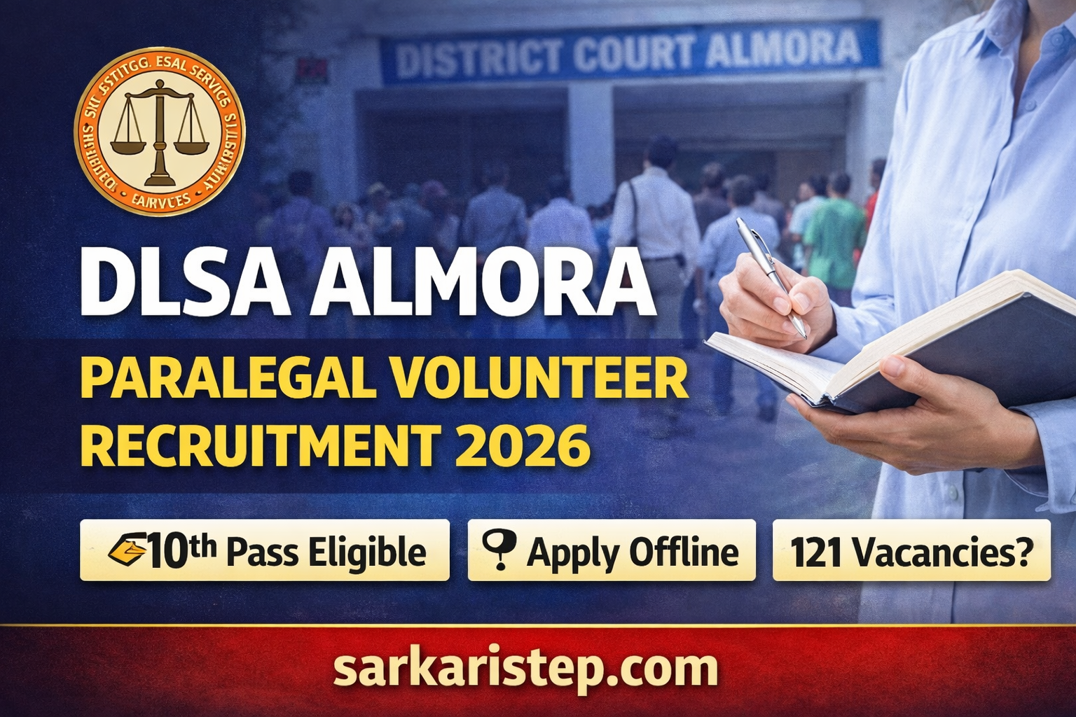 अगर आप समाज सेवा से जुड़े काम करना चाहते हैं और कानून से संबंधित जागरूकता फैलाने में रुचि रखते हैं, तो आपके लिए एक अच्छा अवसर आया है। जिला विधिक सेवा प्राधिकरण, अल्मोड़ा (DLSA Almora) ने वर्ष 2026 के लिए Paralegal Volunteer (PLV) के 121 पदों पर भर्ती की अधिसूचना जारी की है। इस भर्ती के लिए 10वीं पास उम्मीदवार भी आवेदन कर सकते हैं। आवेदन प्रक्रिया ऑफलाइन है और अंतिम तिथि 25 फरवरी 2026 तय की गई है।