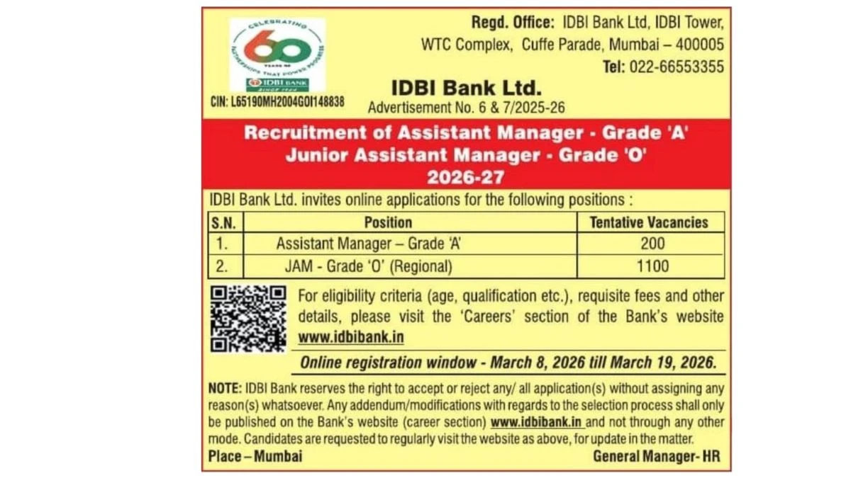 अगर आप Banking sector में सरकारी नौकरी करना चाहते हैं तो आपके लिए एक शानदार अवसर सामने आया है। Industrial Development Bank of India (IDBI Bank) ने वर्ष 2026 के लिए Junior Assistant Manager (JAM) पदों पर बड़ी भर्ती का notification जारी किया है।
