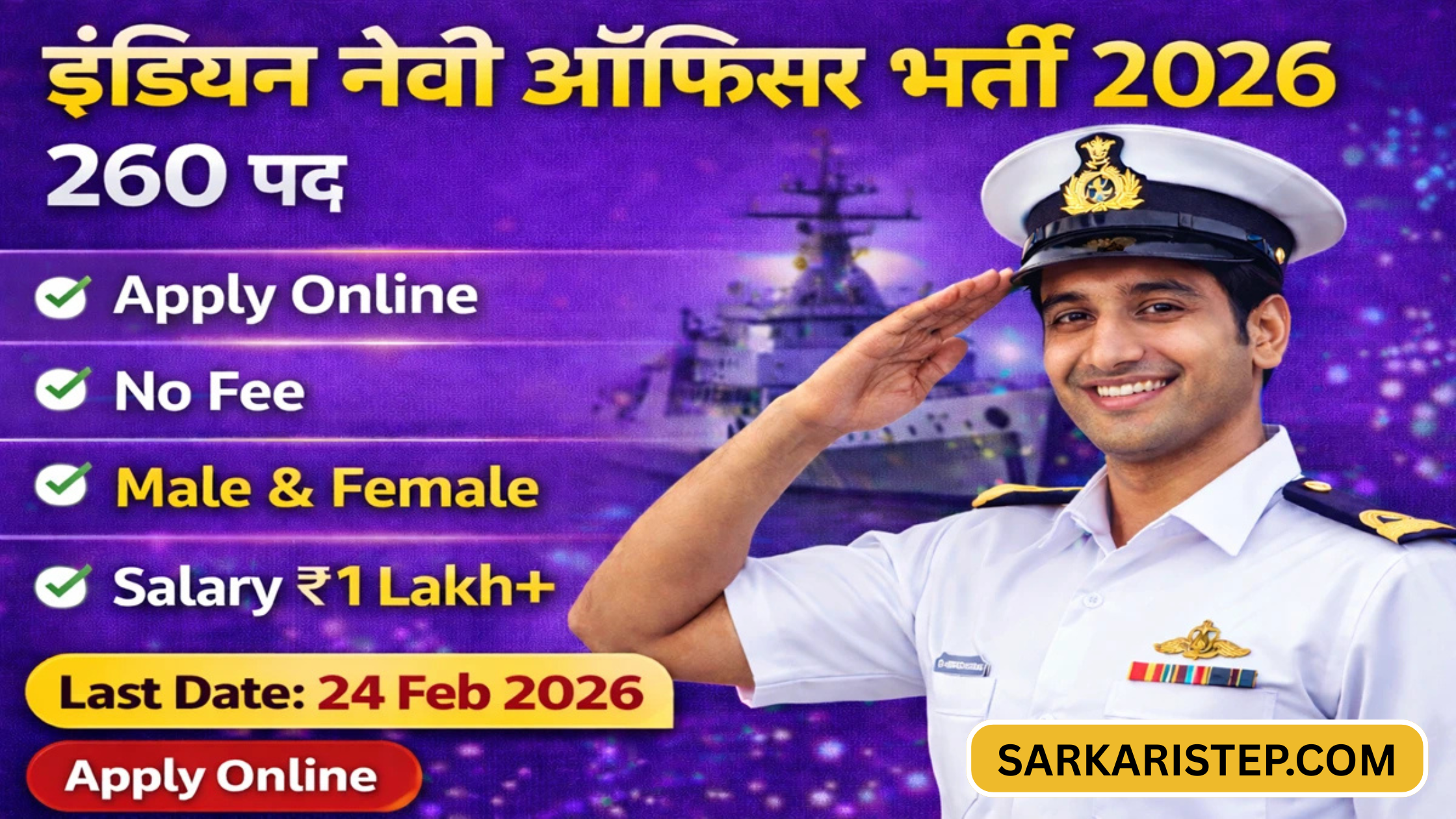 अगर आप Indian Navy में Officer बनकर देश की सेवा करना चाहते हैं, तो आपके लिए बहुत शानदार मौका आया है। Join Indian Navy (Nausena Bharti) ने SSC Officer JAN 2027 (ST 27) Course के लिए 260 पदों पर भर्ती का नोटिफिकेशन जारी कर दिया है।