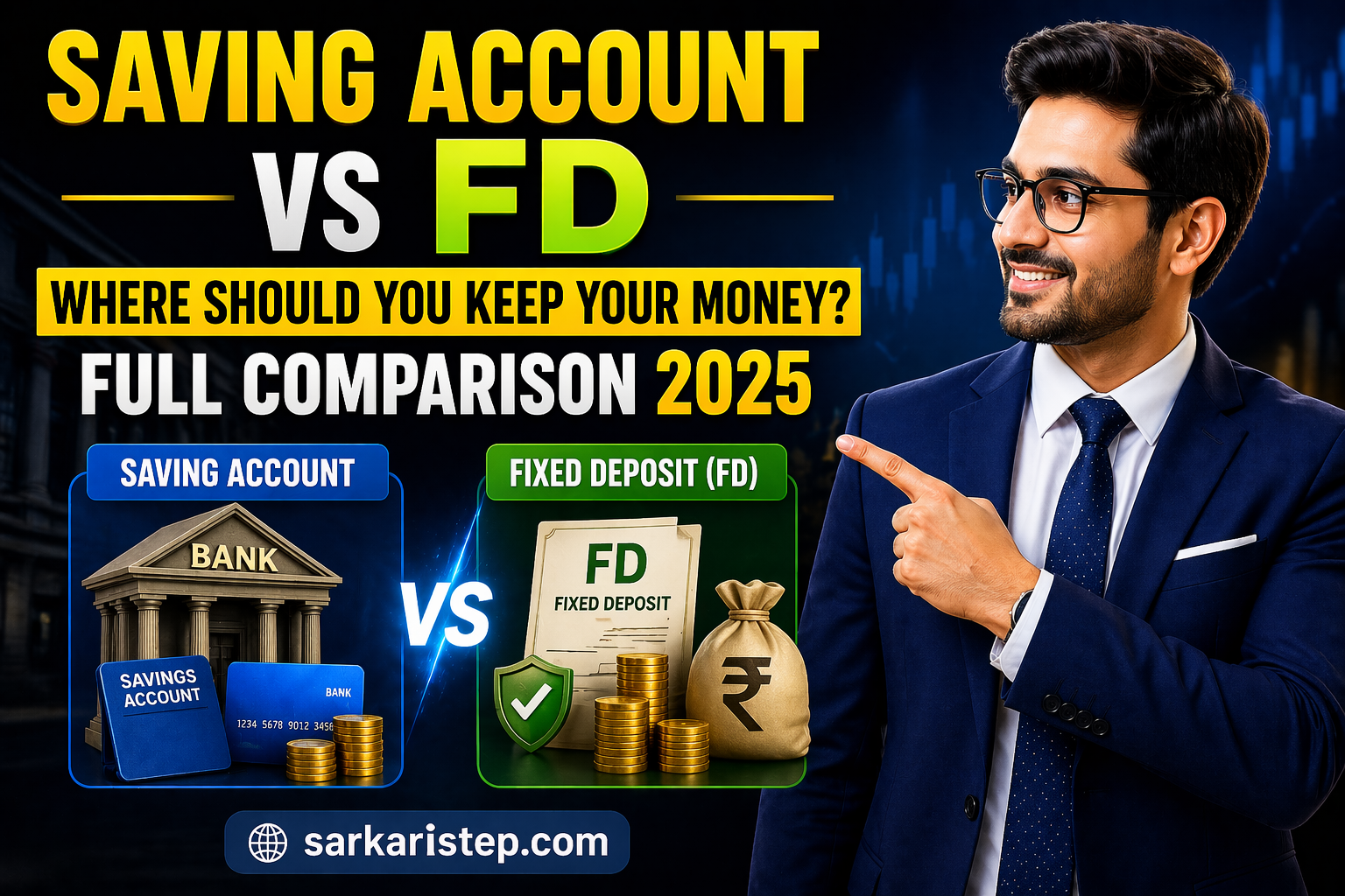 आपके bank account में पैसा पड़ा है और आप सोच रहे हैं — क्या इसे Saving Account में ही रखूँ या FD करा लूँ? यह सवाल हर उस इंसान के मन में आता है जिसने थोड़ी बचत की हो। इस article में हम दोनों को पूरी तरह compare करेंगे — real numbers, examples, और एक clear verdict के साथ।